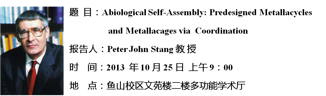 Peter J. Stang教授是美国加州大学伯克利分校化学博士,普林斯顿大学博士后,1997-2007年曾任美国犹他大学理学院院长,2000年当选美国国家科学院院士,2002年当选美国艺术与科学院院士,2006年当选中国科学院外籍院士, 2000-2001年曾担任美国化学会《有机化学杂志》 (JOC) 的主编,并于2002年开始担任国际上最著名的化学期刊之一《美国化学会志》 (JACS) 主编至今。