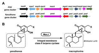 图1. A,yanuthone和macrophorin的生物合成基因簇;B,MacJ的功能示意图。