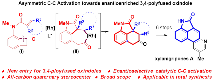 最后,作者还将碳碳键活化策略用于天然产物Xylanigripones A的合成中,从碳碳键活化产物出发,经6步就实现了天然产物简洁高效的首次全合成(14%),这对于在C3位含有季碳手性中心的3,4-稠环氧化吲哚结构活性天然产物的合成、改造以及进一步的生物活性研究都具有重要意义,后续的药物化学工作正在开展。