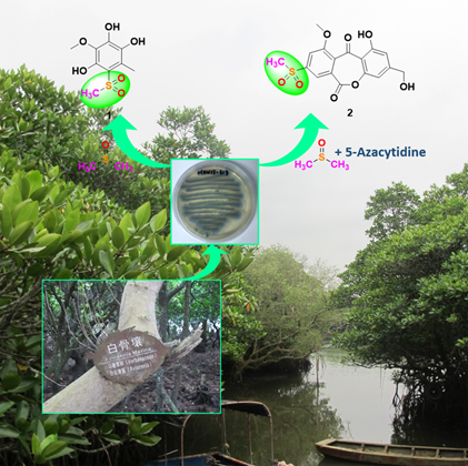 中国海洋大学九游老哥J9俱乐部官网李德海教授团队在采用表观遗传修饰剂激活海洋微生物沉默基因的过程中,发现了一株能够“吃掉DMSO的真菌”。二甲基亚砜(DMSO)作为一种普遍使用的溶剂,在生物体内具有较好的稳定性。该菌株(Neosartorya udagawae HDN13-313)可以降解作为溶剂使用的DMSO,进而将DMSO降解产物整合到该菌产生的其他代谢产物上,从而在芳香环上发生了甲磺酰基化,产生了系列新颖的活性产物。