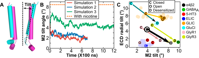 随后通过定点突变以及结合电生理学实验的方式确定了L264(16’)位置的氨基酸残基在模型中起到疏水“门”的作用,在控制整个离子通道的静息、开放和快速脱敏状态而不是缓慢脱敏的状态中起到重要作用。该研究提出的构象转变机制对研究开发针对脊椎动物和昆虫的关闭/静息状态下的乙酰胆碱受体的药物具有重要的指导意义。