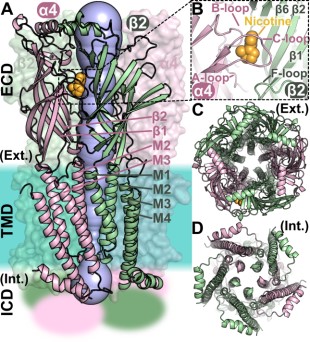烟碱型乙酰胆碱受体(nAChR)属于配体门控型离子通道受体,由5个亚单位构成,在人的大脑等中枢神经系统中大量存在。最新研究发现,作为乙酰胆碱受体的亚型之一,α4β2与一系列中枢神经系统疾病例如毒品酒精成瘾、疼痛、抑郁症、注意力缺陷、多动症、认知障碍等密切相关。因此,α4β2 nAChR已成为重要的镇痛以及戒烟戒酒的作用靶点,而了解并阐明乙酰胆碱受体的作用机制对于相关疾病的发生机理以及针对靶点的药物设计具有重要的意义。
