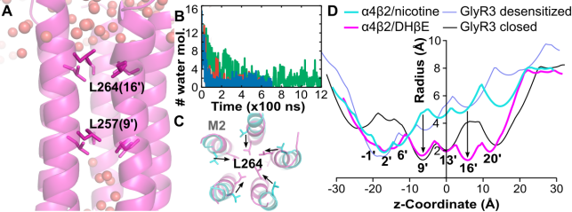 直到2016年,第一个完整的人源乙酰胆碱受体α4β2结合尼古丁的复合物晶体模型才被成功解析。但是结合拮抗剂以及从分子层面揭示其构象转变机制的工作却鲜有研究。课题组以已知晶体为模板成功构建了α4β2结合DHβE的复合物模型。通过分子动力学模拟以及构型分析发现,结合了DHβE后导致α4亚基的C-loop区域发生更大程度的扩张,同时导致胞外区(ECD)的β-sheet位点向外倾斜,这一构象变化通过β1-β2铰链区以及M2-M3铰链区传递到了跨膜区(TMD)。β1-β2铰链区的向外移动导致了M2-M3铰链区和M2螺旋区的向内移动。跨膜区域M2的移动和旋转使得其螺旋结构上的 L257和L264的氨基酸残基位置发生重排,而L257和L264位置恰好是我们通过模拟预测的离子通道的“门”所在的位置,这一氨基酸残基位置的重排导致了“门”的关闭,使得水分子以及离子不能正常通过孔道。