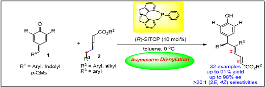 徐涛课题组王德副教授在前期研究的基础上(Chem. Sci.,2015, 6, 7319; Chem-Eur. J.,2014, 20, 15325),以简单的对苯醌烯烃(p-QMs)为起始原料,在催化量手性螺环叔膦(R-SITCP)的作用下,实现了p-QMs和联烯酸酯1,6-共轭加成/芳构化的串联反应一步构建了1,1’-二芳基取代的共轭二烯结构,该反应条件温和、底物普适性和官能团兼容性较高,符合原子经济性的要求,底物适用性广泛,30多不同取代基均兼容。该课题组还研究了反应的机理,提出了反应可能的中间体并通过氘代实验等控制实验进行验证。