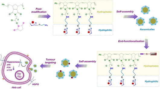 糖胺聚糖(GAGs)是一类线性多糖,由硫酸化的二糖重复单元组成,参与多种生命过程。乙酰肝素酶是一种内源性β-D-葡萄糖醛酸酶,在人类肿瘤细胞和特定组织(例如哺乳动物的胎盘)中高水平表达。乙酰肝素酶与多种生长因子的激活有关,这些因子在导致组织修复、细胞粘附、生长、增殖和分化、癌症血管生成和炎症相关疾病中发挥着重要作用。最近,我们课题组通过正交脱保护化学合成了区域选择性硫酸化的半乳糖胺衍生物,并基于开环易位聚合ROMP)和后修饰策略生成了系列糖聚合物。具有多种硫酸化模式的半乳糖胺聚合物显示出对乙酰肝素酶的显着抑制作用,其中含有3,4,6-O-硫酸化的GalNAc的糖聚合物能够有效抑制乙酰肝素酶活性以及肿瘤细胞的增殖。在此基础上,具有肿瘤靶向作用的iRGD通过末端功能修饰引入。流式细胞术和共聚焦显微镜结果显示,末端功能化的糖聚合物,可以有效进入HeLa细胞并抑制参与肿瘤细胞增殖的信号通路。这些发现有利于推动针对特定肿瘤靶向疗法的新型糖模拟药物开发。