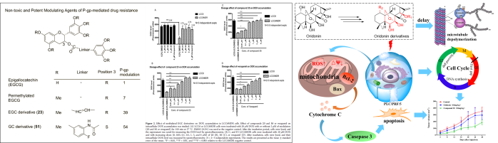 1. 实验室开发了新的天然产物衍生的P-糖蛋白抑制剂来逆转癌症耐药性,设计合成了儿茶素(GC)、甲基化儿茶素(EGC)和二氢杨梅素(DHM)等一系列新型的P-糖蛋白抑制剂并进行体内外活性研究。以冬凌草甲素为母体化合物,通过DAST诱导的重排反应建立了简单高效的冬凌草甲素修饰方式,合成一系列6,20-环氧贝壳杉烯二萜类衍生物的同时,基于构效关系对冬凌草甲素进行修饰,合成了一系列具有良好体内外抗肿瘤活性的凌草甲素衍生物。