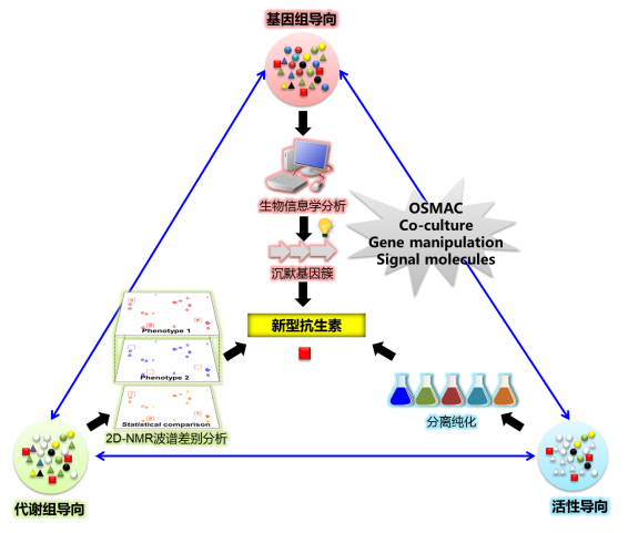 基于多组学技术的海洋放线菌中新型抗生素靶向挖掘研究:通过基因组挖掘(genome mining)OSMAC(one strain many compounds),共培养(co-coculture),信号分子诱导等方法,激活海洋放线菌中的“隐性(cryptic)”次级代谢产物;同时采用LC-MS/2D-NMR代谢组分析技术结合靶向活性追踪策略,迅速获得特定基因簇编码产物的结构新颖性及基因-化合物-活性之间对应关系,从而减少已知化合物的重复分离,高效获得新型抗生素,为海洋微生物来源新一代抗菌药物研发提供先导化合物