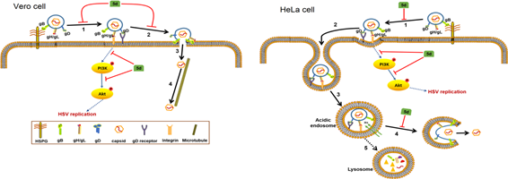 作用机制研究发现化合物5d不仅抑制HSV的吸附过程还可抑制HSV的内吞和膜融合过程。5d定位于细胞核周围区域且与晚期内体和溶酶体存在明显共定位。免疫荧光、DARTS和免疫共沉淀实验表明化合物5d而非未修饰的3a能够特异性地结合HSV的gB蛋白,且分子对接研究表明5d与gB的结合能力远远高于3a。此外,5d还能够显著下调HSV侵染相关的PI3K/Akt信号通路。因此,胍基修饰的嘧啶衍生物5d能够通过靶向结合gB蛋白来抑制HSV的吸附和膜融合过程,并间接干扰PI3K/Akt通路的激活,从而抑制HSV的侵染和复制过程。这为基于胍基修饰的新靶点抗HSV药物的研发提供了物质基础和理论参考。