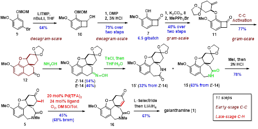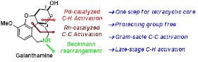我们从简单的原料9出发,通过Rh催化的C-C键的活化,成功的一步构建了ABCD四个环系。特别的是,该反应可以实现克级制备。进而发现在水相中即可完成Beckmann重排反应。在合成后期,作者通过一步Pd催化的C-H活化,区域选择性的引入双键。仅用11步即完成Galanthamine的全合成,并从15’出发还原得到了Lycoramine。我们首次展示了早期C-C键活化和后期C-H键官能团化的策略在复杂生物碱全合成中的战略性应用。