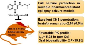 自1880年来,已有25个抗癫痫药物上市,但是仍有30%左右的癫痫患者不能得到有效的治疗。李晓杨副教授与美国南卡罗莱纳医科大学C. James Chou课题组合作,设计合成了一系列针对复发难治性癫痫的维生素K3类似物。代表性化合物3d能够通过血脑屏障,在多种癫痫模型如PTZ斑马鱼模型、老鼠6Hz44mA模型、MES模型以及s.c. PTZ模型均表现出100%保护作用,且无明显毒性。后续的评价中发现3d对CYP450和hERG没有明显的抑制作用,且具有良好的药代动力学性质。深入的药效学及成药性评价还在进行中。以上成果于5月11日发表于药物化学顶级期刊《Journal of Medicinal Chemistry》上,全文链接https://pubs.acs.org/doi/10.1021/acs.jmedchem.0c00168。本论文李晓杨副教授为第一作者,李晓杨副教授和美国南卡罗莱纳C. James Chou教授和Sherine S.L. Chan教授为共同通讯作者,美国查尔斯顿学院Richard A. Himes及美国犹他大学Karen S. Wilcox教授为合作作者。