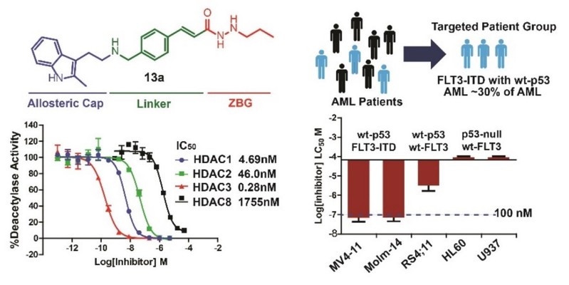 根据目前HDAC抑制剂的不足,李晓杨副教授课题组和美国南卡罗莱纳C. James Chou教授课题组结合目前临床上活性最好的HDAC抑制剂panobinostat的结构,改造其螯合基团异羟肟酸为酰肼,设计合成了一系列化合物。代表性化合物13a的酶活及对AML的细胞活性均在低纳摩尔级,并且在亚型选择性、药代动力学性质及安全性上较先导化合物均有明显提升。另外,13a结合HDAC1和HDAC3的变构位点,为变构抑制剂。抗白血病机制研究发现,13a的抗肿瘤活性具有FLT3和p53依赖性,在wt-p53 FLT3-ITD MV4-11细胞中,13a抑制FLT3通路,下调促凋亡蛋白c-Flip和XIAP,引发细胞凋亡;而在wt-FLT3或 p53-null 细胞中,13a则没有上述作用。以上研究成果4月22日发表于药物化学顶级期刊《Journal of Medicinal Chemistry》上,全文链接https://pubs.acs.org/doi/10.1021/acs.jmedchem.0c00442。李晓杨副教授为第一作者,李晓杨副教授和美国南卡罗莱纳C. James Chou教授为共同通讯作者,九游老哥J9俱乐部官网副教授江余祺为共同第一作者,青岛海洋生物医药研究院徐同强为合作作者。