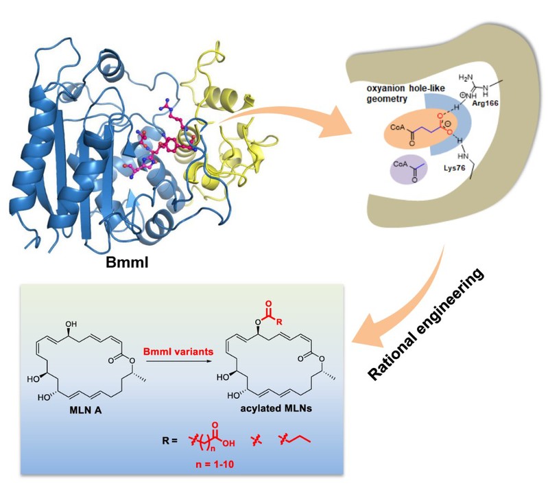 该研究采用体内遗传学、体外酶学、蛋白晶体学等手段,以海洋芽孢杆菌B-9987为研究对象,首次系统阐明了MLNs酰基化后修饰步骤,发现β-内酰胺酶同源蛋白BmmI能够特异性选择带有羧基末端的酰基供体,并对酰基供体和酰基受体显示出较宽的底物选择性。为了探究BmmI的底物选择分子机制,作者解析了BmmI与琥珀酰基共价连接的蛋白质结构,发现一个特殊的“氧阴离子穴”类似结构扮演了酰基供体gatekeeper的角色,通过设计“粗调”和“微调”方案对该“氧阴离子穴”结构进行了理性改造,成功拓宽了BmmI酰基供体选择性。该研究还解析了BmmI与MLN A的复合物蛋白质结构,揭示了酰基受体的结合方式,阐明了BmmI催化酰基化反应的分子机制。该研究系统阐释了酰基转移酶底物选择性的分子机制,为酶的理性设计与改造提供了理论指导,也为创新药物研发提供了有力工具。