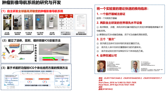 课题组前期参与成功研发、试制了国内首台具有国际领先水平的超高灵敏肿瘤荧光影像导航手术设备(2019812日获得II类医疗器械上市许可,苏械注准20192060927),打破了欧美垄断,并利用其药理学的背景,围绕临床开展了一系列基础科研工作,制定了技术配套的方法学和标准,解决了该技术临床应用的若干关键问题,为该技术推广和发展奠定了基础,也得到了学界和业界的高度关注和认可。2016年起,该设备列为国家科技部十三·五重点攻关项目,其后三次被列入江苏重点研发计划项目,一次江苏工信厅关键核心技术攻关任务。获得了如诺贝尔奖得主W.E.Moerner等生物成像权威的高度评价,并受邀参加了江苏发展大会、临床荧光技术国家年度会议等成像领域国内外高水平会议。