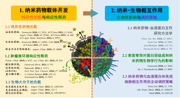 纳米药物靶向递释系统是一种极具开发潜力的药物递送策略,其通过改变药物的代谢动力学和组织分布,提高对肿瘤组织的特异性作用并同时降低药物对正常组织的毒性,在肿瘤治疗等领域得到了广泛的重视和发展。针对现阶段抗肿瘤纳米药物临床转化率低的瓶颈问题,本课题组从高效、智能药物递送纳米载体和纳米反应器的开发和纳米-血液蛋白相互作用两方面开展研究。基于胶体化学和界面聚合,开发了纳米乳液原位包覆技术,针对特定药物的具体性质(如亲疏水性、生物活性、分子尺寸、释药需求等),发展出一系列特异性纳米胶囊药物递释载体和酶级联纳米反应器;结合材料表面修饰与表征、蛋白质组学和细胞、动物实验,建立了纳米材料-血液蛋白相互作用的研究方法学,揭示了纳米药物与血液蛋白吸附行为的作用机制、生物效应及调控方法,为全面、深入认识纳米药物的体内命运、推动抗肿瘤纳米药物的临床转化提供了重要研究基础。 | |||||