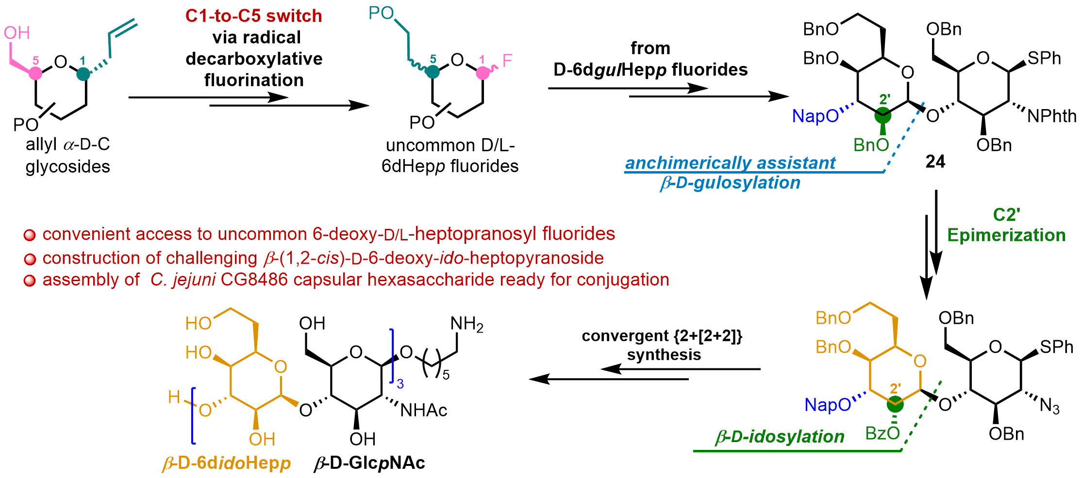 空肠弯曲杆菌的荚膜多糖是其感染宿主的关键毒力因子,目前已发现D-阿卓-/艾杜-/甘露-和L-半乳/古洛型等五种稀有6-脱氧庚糖是组成该菌荚膜多糖的核心结构单元之一。李明课题组采用 C1-到-C5的转换策略,以α-D-葡萄糖/半乳糖/甘露糖/阿洛糖烯丙基碳苷作为起始原料,通过自由基糖醛酸脱羧氟代反应为关键反应,高效完成了6-脱氧-D-艾杜/古洛/阿卓/塔罗庚糖氟苷及其C-5差向异构体6-脱氧-L-葡萄糖/甘露/半乳/阿洛庚糖氟苷,共计8个6-脱氧-庚糖砌块的合成。该方法为不仅稀有D-/L-庚糖砌块的合成提供了新途径,而且所得到氟苷可以直接用于糖苷键的高效构建,为空肠弯曲杆菌荚膜寡糖的合成奠定基础。