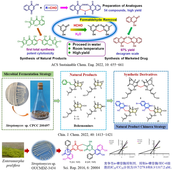 近年来,研究团队在从事海洋放线菌天然产物研究的过程中,发现了系列亚甲基桥联二聚体,初步证实了甲醛参与的非酶催化形成过程,以此为基础开发了亚甲基桥联二聚体的快速合成策略,实现了二聚体及其类似物的高效获取,为药物筛选及先导化合物发现提供了丰富多样的结构(ACS Sustainable Chem. Eng. 2022, 10: 655?661; Chin. J. Chem. 2022, 40: 1413?1421; Sci. Rep. 2016, 6: 20004)(图3)。