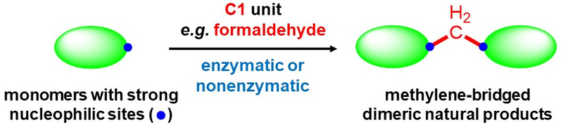 在天然产物研究中,越来越多的二聚体类化合物被发现,许多二聚体表现出了显著优于其单体化合物的生物活性,而且它们往往具有独特的生物合成机制。因此,二聚体天然产物正成为化学合成、生物合成以及药理活性研究者所关注的焦点之一。在众多的天然二聚体中,亚甲基桥联二聚体是一类非常独特的结构类型,它们是由一个亚甲基(-CH2-)将两个单体连接而成,结构中的亚甲基多来源于生物合成中的一碳单元,其中以甲醛最为常见(图1)。