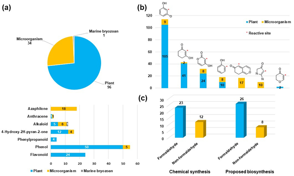 研究团队聚焦天然来源的亚甲基桥联二聚体,在国际上首次全面系统地总结了131个该类型天然产物的结构、来源、生物活性、化学合成以及生物合成的相关内容(图2),重点围绕亚甲基的来源及可能的非酶催化形成过程进行了阐释和探讨,为甲醛参与的二聚体类天然产物的形成机制研究提供了重要指导,也为化学空间拓展提供了参考和借鉴。