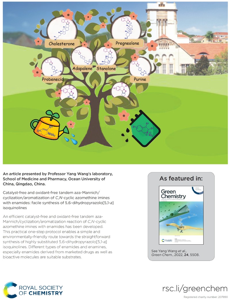 近日,中国海洋大学九游老哥J9俱乐部官网、海洋药物教育部重点实验室王杨课题组在药物分子优势骨架的合成新方法方面取得重要进展,相关研究成果以“Catalyst-free and oxidant-free tandem aza-Mannich/cyclization/aromatization of C,N-cyclic azomethine imines with enamides: facile synthesis of 5,6-dihydropyrazolo[5,1-a]isoquinolines”为题,以封面文章(图1)的形式发表于在国际化学领域顶级期刊《Green Chemistry》(IF = 11.034)。
