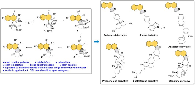 王杨课题组从C,N-亚甲胺内盐和烯酰胺出发,通过全新的氮杂Mannich反应/环化/芳香化机理,发展了一种绿色、高效构建异喹啉并吡唑结构的方法。该方法无需添加任何添加剂,且反应条件温和,底物适用范围广,产率高,为异喹啉并吡唑骨架的合成提供了一种全新的思路和策略。烯酰胺作为一种活性烯烃,受氮原子电子效应的影响,其碳碳双键的活性要比普通的烯烃高,因此该反应无需催化剂和添加剂。烯酰胺中的乙酰胺基可以作为离去基团,在特定条件下可以发生碳氮键的断裂,因此该反应无需氧化剂。此外,该合成方法通过氮杂Mannich反应启动反应,因此反应底物不受取代基的限制,可以构建多环体系,该反应的普适性较好,不同种类的C,N-亚甲胺内盐和烯酰胺都可以很好地进行反应,并以良好至优异的产率得到异喹啉并吡唑衍生物。该反应具有较好的应用前景,由已上市药物分子丙磺舒、阿达帕林以及雄诺龙衍生来的烯酰胺,可以与C,N-亚甲胺内盐反应。另外由复杂活性分子烯醇酮、胆甾酮、嘌呤衍生来的烯酰胺也同样能够顺利地进行反应,合成了一系列复杂的基于药物分子的异喹啉并吡唑衍生物。基于发展的方法,作者开发了一条CB1受体拮抗剂III的全新合成路线。从反应的标准产物出发,通过几步转化可以高效地合成CB1受体拮抗剂III,,相比于传统合成方法,合成路线得到缩短,产率也得到了提高。