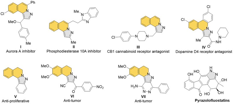 图2. 含有异喹啉并吡唑骨架的药物活性分子及海洋天然产物