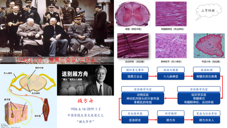 在谈到教学过程中如何挖掘和融入“课程思政”时,刘云章老师认为首先应该找准切入点,然后进行精心设计,才能做到润物无声的效果,并详细介绍了一个“课程思政”教学案例。该案例以德黑兰会议“三巨头”合影为切入点,进而讲到小儿麻痹症和脊髓灰质炎病毒,然后带领同学们一起回顾脊髓横切、有髓鞘神经、运动终板等组织学实验内容,启发同学们思考这些组织切片之间的内在联系,将话题引至神经肌肉接头的兴奋传递、骨骼肌的收缩等动物实验内容,再过渡至脊髓灰质炎疫苗的研发和顾方舟夫妇的感人事迹。将国际重大事件、疾病与健康、致病机理、组织学和动物实验教学内容、药学专业使命、科学精神、家庭与社会责任等多个维度串联,完成了一次精彩的课程思政与实验教学有机融合。