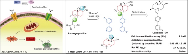 1、天然产物是新药发现的重要来源,课题组围绕天然产物骨架进行结构修饰及活性评价,挖掘到多个活性显著,有望临床转化的小分子候选药物。首先,基于二萜类天然产物穿心莲内酯的基本骨架,构建凝血酶受体-1(PAR1)拮抗剂,筛选得到具有良好PAR1抑制活性,能够显著抑制血小板聚集、体内代谢稳定、药代动力学性质良好的候选药物(J. Med. Chem.)。第二,筛选发现三苯基磷阳离子能够携带小分子药物绕过真菌细胞外排泵的外排作用,同时有效被膜渗透,解决抗真菌药物易耐药的问题。基于此,开发得到了多个活性显著的抗真菌候选药物(Nat. Comm.)。同时,三苯基磷阳离子的化学修饰策略能够有效解决氟康唑类药物的耐药问题(Bioorg. Chem.)。第三,在异甜菊醇结构基础上,引入抗肿瘤活性基团及溶酶体靶向基团,筛选得到纳摩尔级抗肿瘤小分子且具有较高的安全性(Eur. J. Med. Chem.)。另外,以吩噻嗪结构为基础,挖掘到2个化合物的活性优于迄今为止最为有效的铁死亡抑制剂(ACS Med. Chem. Lett.)。