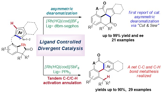 近日,海洋药物教育部重点实验室徐涛教授课题组与山大陆刚教授合作,发表了基于碳-碳键活化反应,通过配体调控实现发散性催化——不对称去芳构化或碳氢键活化/环化的研究成果,以“Divergent Rh-Catalysis: Asymmetric Dearomatization Versus C-H Activation Initiated by C-C Activation”为题,发表于ACS系列学术期刊《ACS Catalysis》。(影响因子13.7,ACS Catal. 2023, 13, 4873–4881)。