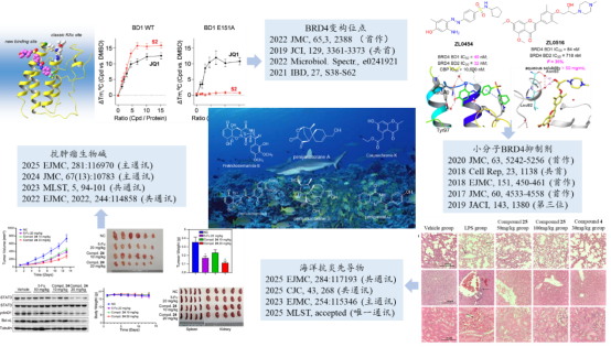 近年来主要从事基于海洋天然产物的抗炎、抗肿瘤先导物发现工作,取得了多项成果,主要包括: ? 首次发现并刻画了溴结构域蛋白4(BRD4)全新变构调节位点,刻画了该变构调节位点的关键氨基酸残基,利用氨基酸单点突变验证了其干扰组蛋白赖氨酸对BRD4经典口袋的结合功能,为下一步寻找BRD4新的作用靶点和信号通路奠定了基础。 ? 利用骨架跃迁及理性结构改造,设计合成得到新型苯酚类及色原酮类BRD4抑制剂,化合物ZL0454和ZL0516等分别实现对BRD4 及BRD4 BD1的选择性。通过分子生物学手段揭示了其通过阻断RelA-BRD4信号通路、干扰促炎性因子IL-6和CIG5等基因表达的抗气道炎症作用机制。 ? 基于喹唑啉酮类海洋生物碱penipanoid C,通过设计结构多样性的连接链,靶向获得对BRD4 BD2具有选择性的纳摩尔级小分子抑制剂,对LPS诱导的巨噬细胞中TNF-α和IL-6的生成具有显著抑制作用;小鼠急性炎症模型中,50 mg/kg剂量下对全身炎症的缓解作用与临床III期药物RVX-208相当,为高效低毒海洋抗炎分子提供了备选。