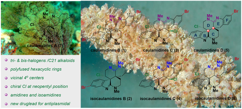 海洋生物对于海水中卤素(Cl, Br, I)的利用是其区别于陆生生物的“特殊技能”。含有卤素“点缀”的天然分子,特别是含Br和I的天然产物是其海洋来源的重要特征。卤素是海洋生物用来“调整”其多用途次级代谢产物的一种独特的策略,通常会导致次级代谢产物生物活性的改变。引入卤素不可避免的增加了天然产物结构的复杂性和化学鉴定的难度。多卤化生物碱Caulamidines B-D和Isocaulamidines B-D是由Gustafson小组从帕劳群岛附近的海鞘Polyandrocarpa sp.中分离得到的系列含Cl和Br的生物碱。研究表明,这些天然产物在NCI-60细胞筛选中表现出中等细胞毒性,其同系物Caulamidines A和B则表现出了对于氯喹耐药型疟原虫的抑制活性,其前所未有的分子结构和优良的生物活性,使(iso)caulamidines类化合物成为潜在的抗疟原虫药物先导化合物,引起了化学合成和新药研发领域科研人员的广泛关注。