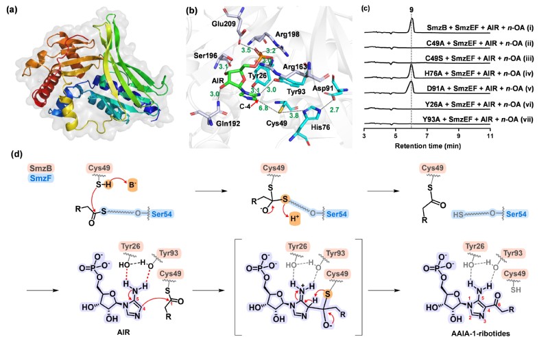 研究人员首先通过大片段的基因敲除与基因的异源表达实验鉴定了此株Streptomyces sp. OUCMDZ-944中的AAIAs生物合成基因簇(smz)。单基因缺失突变实验进一步明确了生物碱骨架合成的四个关键基因smzB, -C, -E和-F。结合关键基因的功能预测和突变菌株代谢谱的变化,逐渐揭开了新型FCase SmzB的神秘面纱。蛋白表达及体外酶反应实验进一步清晰地阐明了四个关键基因的功能,明确了AAIAs的生物合成途径。SmzE催化脂肪酸活化连接到酰基载体蛋白(ACP) holo-SmzF上后,由蛋白SmzB催化AIR和活化酰基之间发生FCA反应,再经由SmzC蛋白催化中间体的N-糖苷键断裂生成AAIAs类化合物,关键中间体的底物饲喂实验证明菌株的固有酶可催化脱磷酰化生成AAIA-1-ribosides,并证明了脂肪酸底物的宽泛性,5C~14C的脂肪酸均可被活化生成相应的酰基化产物。为了深入理解蛋白SmzB的催化机制,研究人员利用AlphaFold2构建了蛋白SmzB的3D结构模型,并预测了其催化口袋,分析了蛋白SmzB的保守残基。底物AIR与蛋白SmzB的docking分析及构象分析指导下的蛋白突变体的构建及催化活性研究,证明了氨基酸残基Tyr26、Cys49和Tyr93对蛋白SmzB催化功能的发挥至关重要。