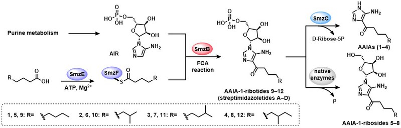 本文在发现7个新的4-酰基-5-氨基咪唑生物碱(AAIAs)类天然产物的基础上,首次解析了AAIAs的生物合成途径,并揭示了AAIAs类天然产物来自两个初级代谢(嘌呤代谢与脂肪酸代谢)之间的对话与互作,从中发现了一个独特而新颖的FCase-SmzB,突破了目前FCase的芳香底物的结构限制,为此类生物碱的结构拓展及生物合成与应用提供了重要思路。