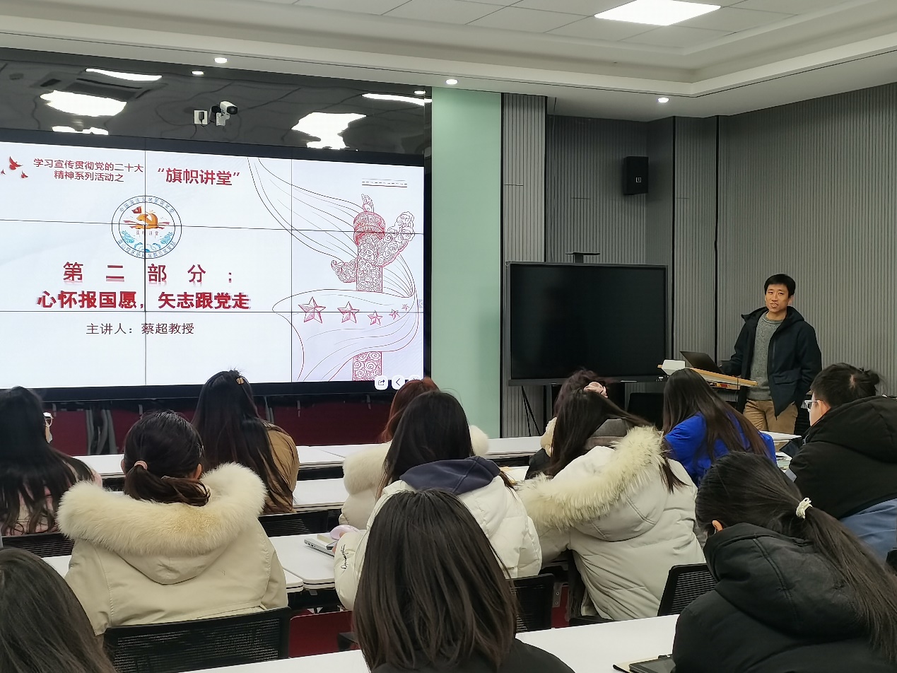 12月21日下午,“旗帜讲堂”第三期在药物楼学术报告厅顺利开展。本期讲堂邀请九游老哥J9俱乐部官网院长助理、教工第二党支部书记蔡超教授担任主讲人,以《心怀报国愿,矢志跟党走》为题,深刻理解习近平总书记关于加强基础研究重要论述的科学内涵,教育引导青年党员献身科学研究事业,为实现高水平科技自立自强贡献青春力量。讲堂由鱼山校区研究生第三党支部书记王晓主持。