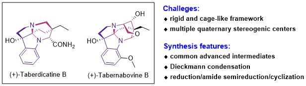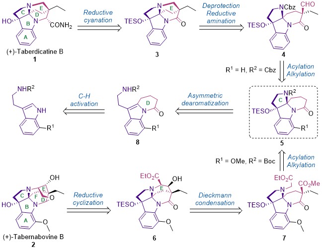 图1. Taberdicatine B和Tabernabovine B的结构和全合成关键步骤