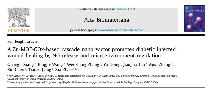 该研究基于内源性改善(降低葡萄糖和pH)和外源性抵抗(抗菌和抗炎)相结合的“安内攘外”策略,为糖尿病伤口水凝胶敷料的开发提供了新的思路。另外,AZG-Gel应用于创面时的pH变化特性,有望制备成“比色创可贴”实现糖尿病伤口的“可视化”治疗(图2)。 相关成果最近以“A Zn-MOF-GOx-based Cascade Nanoreactor Promotes Diabetic Infected Wound Healing by NO Release and Microenvironment Regulation”为题,发表于《Acta biomaterialia》(IF=9.7,TOP期刊)。中国海洋大学九游老哥J9俱乐部官网2021级硕士研究生相广丽为该论文第一作者,赵峡教授为通讯作者。