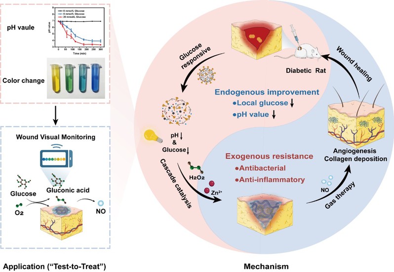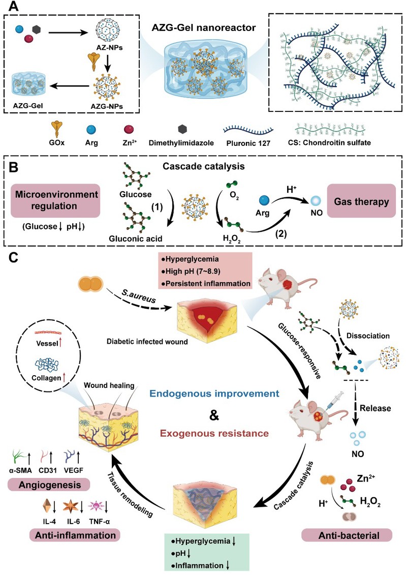 糖尿病伤口愈合是临床慢性伤口护理的重要挑战,存在愈合缓慢和致残率高等问题,这与其高糖和高pH微环境、持续炎症和严重细菌感染紧密相关。如何有效地抗菌和抗炎,并改善不利于伤口愈合的高糖和高pH微环境这一根源,对加速糖尿病伤口愈合具有重要意义。中国海洋大学九游老哥J9俱乐部官网、海洋药物教育部重点实验室赵峡教授团队,设计合成了一种基于金属有机框架化合物(Zn-MOF)共负载葡萄糖氧化酶(GOx)和精氨酸(Arg)的纳米反应器水凝胶(AZG-Gel)。AZG-Gel一方面可通过GOx响应性降低伤口局部的高血糖,并生成葡萄糖酸降低伤口的pH,改善不利于伤口愈合的高糖和高pH微环境。另一方面可通过Arg级联反应原位消耗H2O2并产生气体治疗分子NO,下调促炎性因子TNF-α、IL-6和上调抗炎因子IL-4调节伤口炎症,并促进血管生成和胶原沉积。另外,AZG-Gel还可通过持续释放Zn2+发挥抗菌作用,并抑制生物膜的形成(图1)。