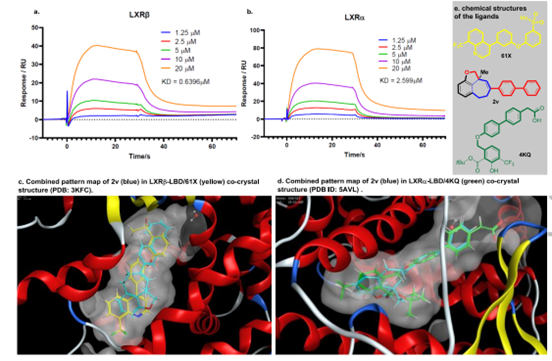 科研团队在前期研究的基础上,提出了苯并环丁烯酮作为4σ组分,共轭二烯烃作为4π组分的成环思路,突破原有的共轭二烯烃自身二聚的[4+4]范式。研究发现N-甲酰基糖精(N-formylsaccharin)对于控制一氧化碳的脱除和保留发挥重要作用。通过rhodacyclopentenone活性中间体,实现了可调控的Type I型 [4σ + 4π] 和 [4σ + 4π - 1]发散式环加成反应开发。以中等到优异的产率完成了一系列5-6-7和5-6-8稠环并环产物的合成。团队与山东大学陆刚教授合作,对反应机理进行了密度泛函理论(DFT)计算,经动力学监测和13C同位素标记实验提出了合理的反应机理。此外,5-6-7并环产物2v表现出与核受体LXRβ的高度选择性结合能力(其选择性LXRβ/α = 4 : 1),达到目前已报道的最优选择性(KD = 0.64 μM,图2)。长期以来,LXR被作为胆固醇代谢调节的关键感受器和潜在治疗靶点,未有任何药物上市。本研究团队发现的新型小分子配体,为开发靶向核受体LXR的原创药物提供了重要化学空间和物质基础。