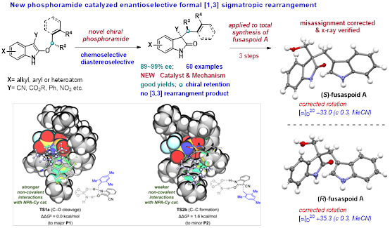 徐涛课题组从2-烷氧基吲哚出发,开发了一种新型的手性膦酰胺(NPA-Cy)催化[1,3]- σ重排反应。该反应具有较优的底物范围(60个实例)以及良好的产率和高的对映选择性(89-99% ee)。团队与山东大学陆刚教授合作,对反应机理进行了密度泛函理论(DFT)计算发现底物和催化剂之间的非共价相互作用是决定对映选择性的主要因素。同时该反应作为关键步骤成功应用于fusaspoid A的首次全合成,非常简洁地展示了其在高对映体的氧化吲哚合成中的潜力。