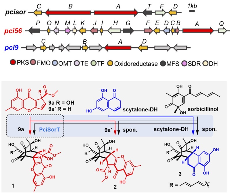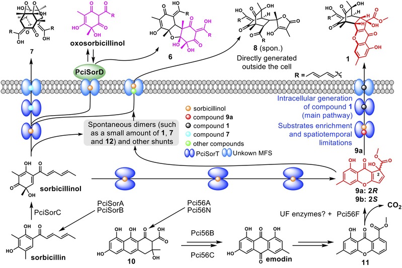 在化合物1-3的生物合成过程中,三条完全独立的基因簇pci9,pci56和pcisor分别合成高度活泼的单体分子9a/b、scytalone-DH和sorbicillinol,随后MFS样转运超家族蛋白PciSorT对9a和sorbicillinol进行富集,并通过区域和立体选择性的分子间Diels-Alder(DA)环化生成杂合二聚体1。化合物2和3则是9b和scytalone-DH作为亲双烯体与sorbicillinol发生符合热力学偏好的自发DA环化反应的产物(图1)。同时,通过对编码SorD同源蛋白的基因pcisorD进行敲除、回补、分子对接和点突变,证实PciSorD不参与1-3中的DA反应,而是参与了sorbicillinol与oxosorbicillinol的迈克尔加成反应,其中E136和N361在控制反应的区域选择性和烯醇式结构稳定方面发挥了关键作用。最终,研究人员提出了细胞水平上一系列二聚体在空间范围内的生物合成过程(图2)。