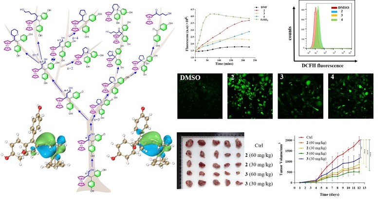 图1. 羟烷基Ferrocifen类化合物的氧化代谢、生物活性机制研究及理论计算工作