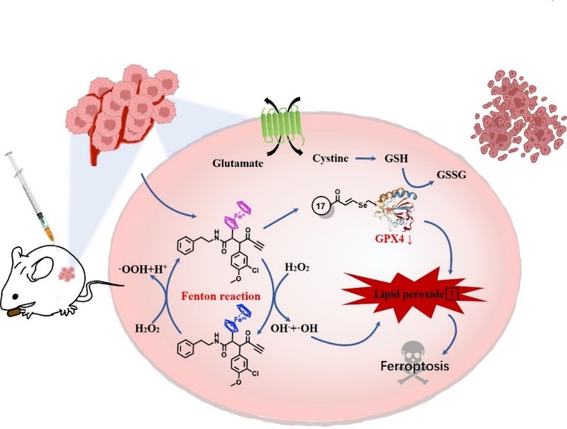 铁死亡是近年来新发现的一种铁依赖的氧化损伤而诱发的调节性细胞死亡类型,研究表明铁死亡可以诱导多类肿瘤耐药细胞株死亡。铁死亡发生机制中包括三个主要部分:脂质代谢、铁稳态和抗氧化通路。细胞内铁介导的芬顿(Fenton)反应是引发铁死亡脂质过氧化物累积的主要来源之一。基于二茂铁亦能催化发生芬顿反应,课题组首先建立了“基于二茂铁的类药性有机金属化合物库”并对其进行活性筛选,但并未发现具有明显铁死亡诱导活性的化合物,这表明二茂铁与铁死亡并无直接联系。依据铁死亡信号通路中的关键蛋白谷胱甘肽过氧化物酶4(Glutathione peroxidase 4,GPX4)与其抑制剂的结合模式,研究人员通过合理药物设计,采用“一石二鸟”策略将二茂铁与铁死亡诱导剂ML162、RSL3、ML210有机结合,构建了一系列靶向GPX4的二茂铁化合物。其中化合物17活性最突出(IC50=0.007 μM),同时可以被铁死亡抑制剂Fer-1逆转,对正常细胞毒性较小,表现出良好的选择性。机制研究表明,17可以与GPX4蛋白结合抑制其活性并下调其表达,并且在分子和细胞水平证实其二茂铁可以通过Fenton反应有效诱导ROS产生,从抗氧化通路以及铁稳态两方面协同发挥铁死亡的诱导活性。体内抗肿瘤实验证实17能够显著抑制肿瘤生长,且没有观察到明显的毒副作用。该研究证实二茂铁良好的亲脂性和独特的空间结构可以提高小分子抑制剂的靶标选择性,并且二茂铁可以通过Fendon反应诱导ROS产生增强铁死亡诱导活性(图2),为研发二茂铁抗肿瘤药物提供了新的思路。