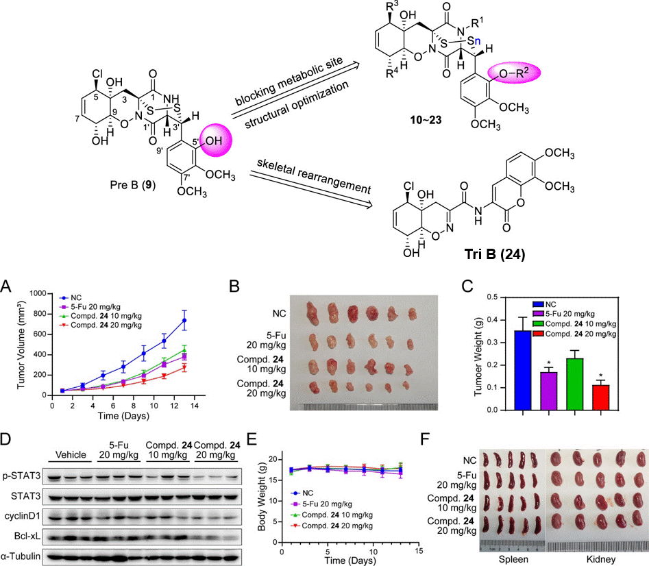 团队前期从深海微紫青霉Penicillium janthinellum SH0301中分离获得靶向STAT3的环硫二酮哌嗪Pre B,其对多种肿瘤细胞具有低微摩尔级增殖抑制活性(Mar. Life Sci. Technol., 2023, 5, 94-101)。但代谢稳定性差(在小鼠血浆中的半衰期小于5 min)影响了其体内抗肿瘤药效的发挥。为了提高代谢稳定性,团队采用封闭代谢位点及骨架重排等基于配体结构的药物设计策略,获得了一系列Pre B衍生物。其中,通过骨架重排获得的海洋天然产物Tri B对结肠癌细胞HCT116的抑制IC50为120 nM。同时,Tri B显示出更好的代谢稳定性(小鼠血浆中的半衰期为31 min)及口服生物利用度(F = 37.5%)。WB结果显示Tri B以剂量和时间依赖的方式阻断了JAK/STAT3信号通路,给药1 h即可迅速抑制STAT3磷酸化水平;在HCT116异种移植瘤裸小鼠模型中,Tri B在20 mg/kg的剂量下显著抑制肿瘤生长(TGI = 65%),是值得进一步开发的抗结肠癌海洋药物先导化合物。