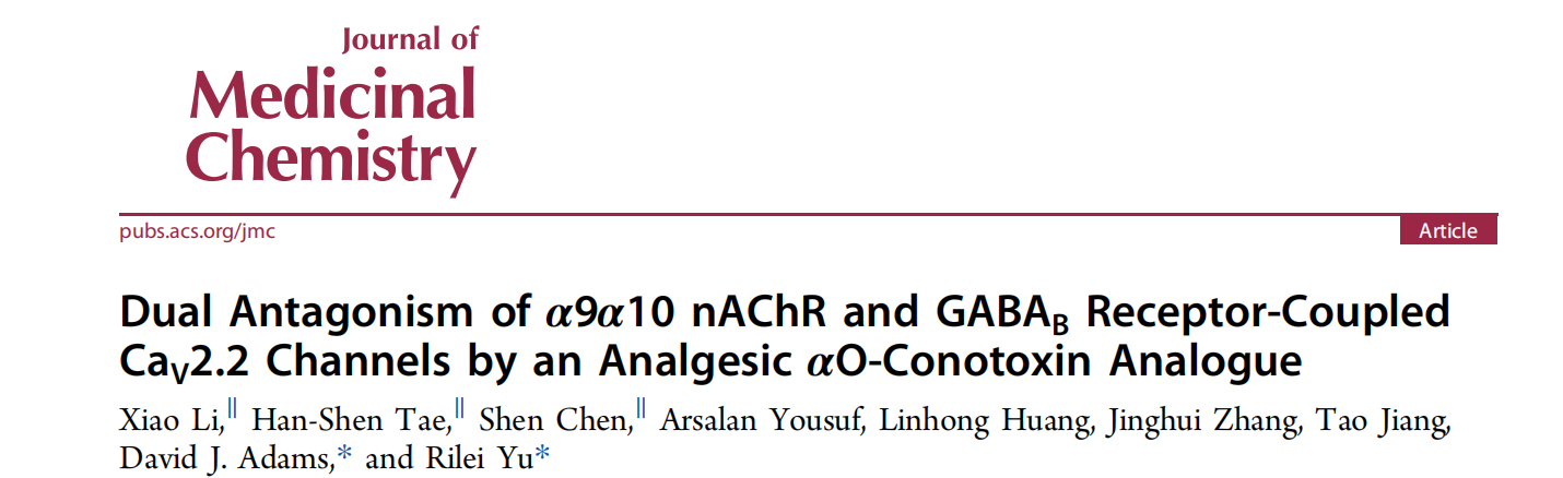 疼痛是继心脑血管疾病、肿瘤之后的第三大健康问题,然而由于现有镇痛药存在局限性,导致临床对于疼痛治疗的缓解率不足20%,因此亟需开发出新型镇痛药物来满足临床需要。芋螺毒素是由海洋软体动物芋螺的毒腺所分泌的一系列富含二硫键的生物活性肽,能够特异性地靶向细胞膜上的不同离子通道受体,从而具有重要的药用潜力。目前已有十几种芋螺毒素被表征具有镇痛作用。于日磊课题组致力于镇痛芋螺毒素的研究,对其进行合理的结构优化,以获得具有潜在成药性的先导化合物。2024年取得了显著研究进展,在Journal of Medicinal Chemistry杂志 (中科院1区TOP,IF=6.8)发表文章3篇。