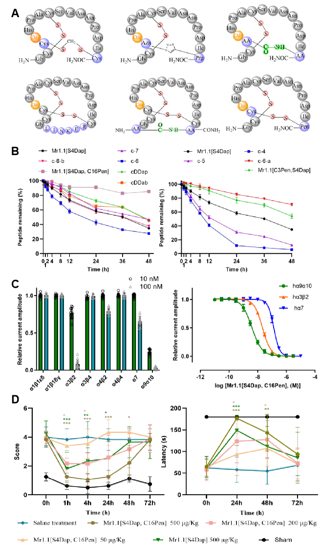 图3. Mr1.1[S4Dap]的结构优化。(A)Mr1.1[S4Dap]的化学修饰策略;(B)Mr1.1[S4Dap]类似物稳定性测试;(B)Mr1.1[S4Dap, C16Pen]在乙酰胆碱受体上的活性与选择性测试;(D)[S4Dap, C16Pen]对化疗药物诱导的冷痛的镇痛活性。