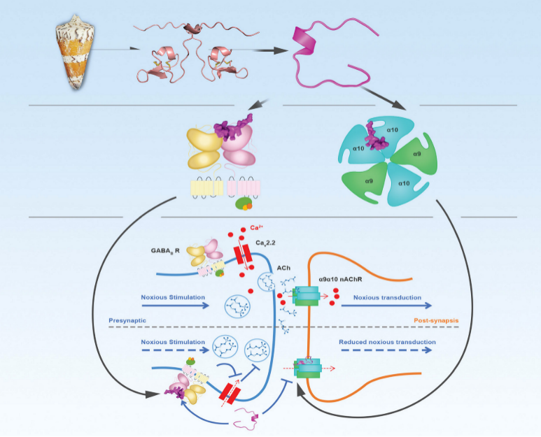图1. 新型海洋来源镇痛芋螺毒素类似物Gex-2设计及作用机制总结