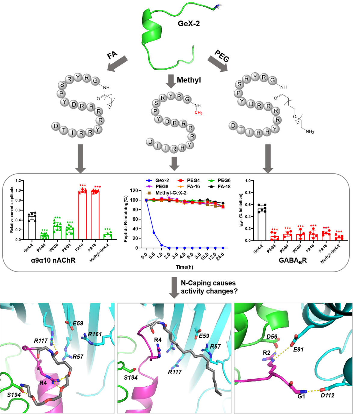 然而,GeX-2这种直链肽血浆稳定性通常较差,限制了其成药转化。于日磊课题组尝试将脂肪酸链/聚乙二醇链偶联至GeX-2的N端以期提高其稳定性。然而,N端的偶联导致了多肽对GABABR的活性丧失。研究者通过结合模式探究阐明了N端偶联导致多肽活性丧失的原因,并采取甲基封端的方式验证了推论的准确性。相关成果以“N-terminal capping of the αO-conotoxin analogue GeX-2 improves the serum stability and selectivity towards the human α9α10 nicotinic acetylcholine receptor”为题发表在Journal of Medicinal Chemistry上。九游老哥J9俱乐部官网博士研究生李晓为该研究成果第一作者,九游老哥J9俱乐部官网硕士研究生周升露、卧龙岗大学的Han-shen Tae博士为该文章共同作者,David J. Adams教授、于日磊教授为通讯作者。文章链接:https://pubs.acs.org/doi/full/10.1021/acs.jmedchem.4c01758。