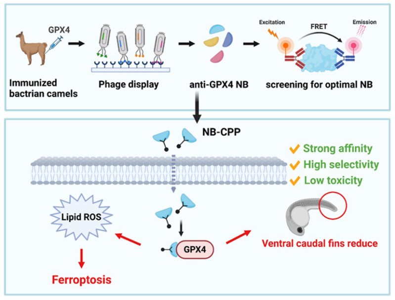 铁死亡是近年来定义的一种新型细胞死亡形式,其特征是由于不受限制的脂质过氧化和随后的膜损伤导致的铁依赖性细胞死亡。越来越多的研究表明,铁死亡在肿瘤、神经退行性疾病和组织缺血再灌注损伤等病理过程中发挥着重要作用。谷胱甘肽过氧化物酶4(Glutathione peroxidase 4, GPX4)是细胞铁死亡的关键靶点,经药物治疗的肿瘤细胞耐药株的生存高度依赖GPX4,因此GPX4抑制剂被视为解决肿瘤耐药问题的重要途径。但GPX4的活性位点附近结构相对扁平,是一个较难成药的靶点,开发GPX4的小分子抑制剂具有非常大的挑战。目前GPX4的小分子抑制剂大多存在生物利用度低、选择性较差等问题,亟需开发新型GPX4抑制剂。近日,中国海洋大学九游老哥J9俱乐部官网邱雪课题组与合作者在化学综合性期刊《Chemical Science》发表了一篇题为“A Potent and Selective Anti-Glutathione Peroxidase 4 Nanobody as Ferroptosis Inducer”的研究论文,开发了一种可以通过靶向GPX4诱导肿瘤细胞发生铁死亡的纳米抗体,显示了其在抗肿瘤治疗方面的应用潜力。