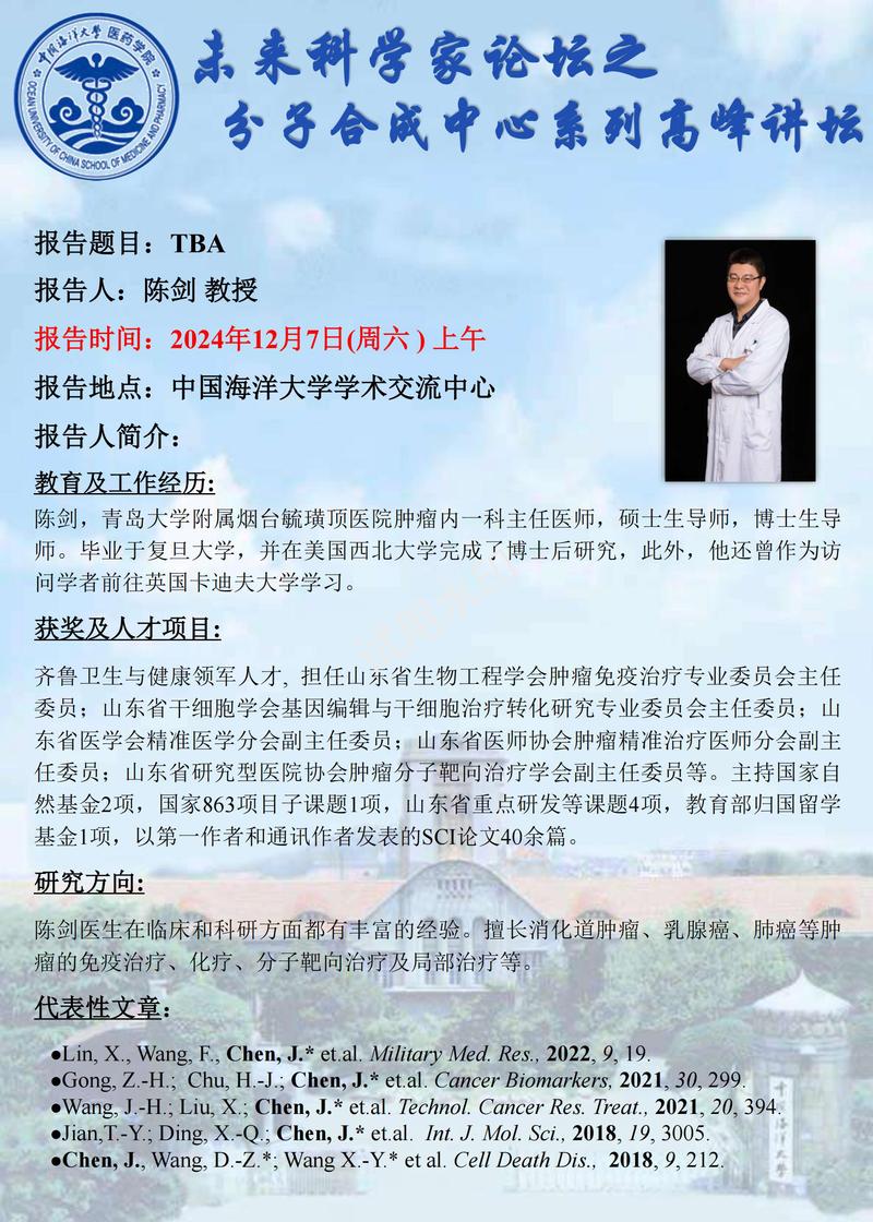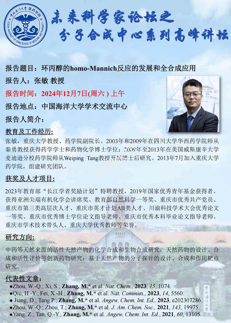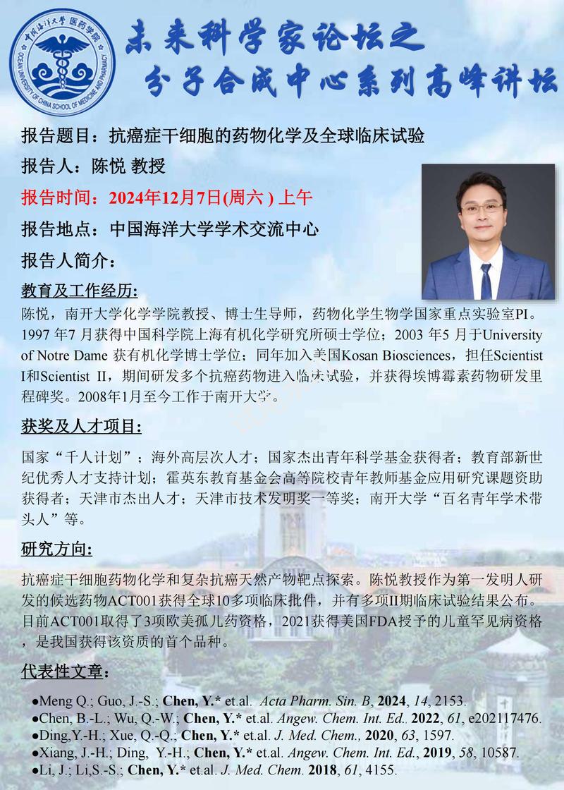 未来科学家论坛之分子合成中心系列高峰讲坛: 4.抗癌症干细胞的药物化学及全球临床试验; 5.环丙醇的homo-Mannich反应的发展和全合成应用; 6.TBA