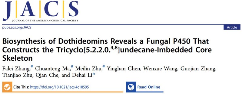 2月14日,中国海洋大学九游老哥J9俱乐部官网、海洋药物教育部重点实验室、青岛海洋科技中心海洋药物与生物制品功能实验室李德海教授团队在国际顶级化学学术期刊Journal of the American Chemical Society(JACS)在线发表了题为“Biosynthesis of Dothideomins Reveals a Fungal P450 That Constructs the Tricyclo[5.2.2.0.4,8]undecane-Imbedded Core Skeleton”的研究论文。