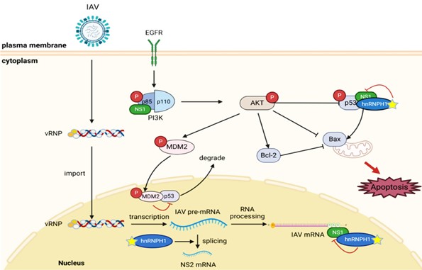 图2. 宿主因子hnRNPH1与NS1互作调控IAV复制机制示意图